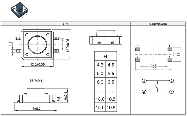 輕觸開關的原理:又叫按鍵開關,最早出現在日本[稱之為:敏感型開關]使用時以滿足操作力的條件向開關操作方向施壓開關功能閉合接通,當撤銷壓力時開關即斷開,其內部結構是靠金屬彈片受力變化來實現通斷的。輕觸開關由:嵌件、基座、彈片、按鈕、蓋板組成其中防水類輕觸開關在彈片上加一層聚酰亞胺薄膜。